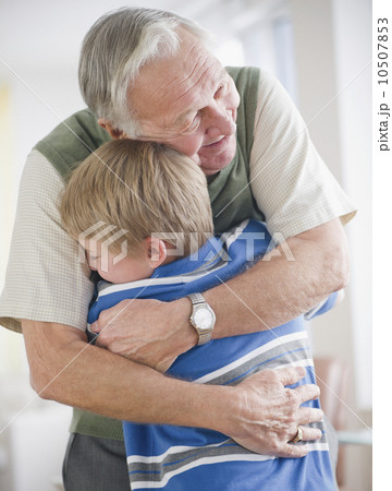 Grandfather hugging grandson (8-9)