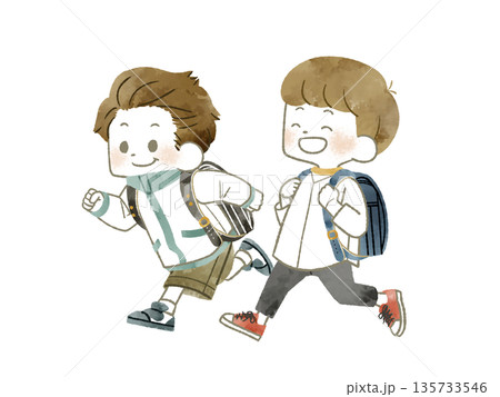 笑顔で歩く男の子 手描き水彩イラスト素材