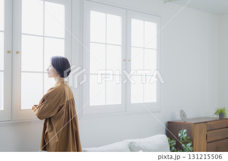 部屋で通販の荷物を確認をする女性のライフスタイルイメージ