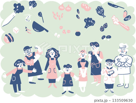 親子で楽しくお菓子作り・料理をする様子のイメージイラスト素材