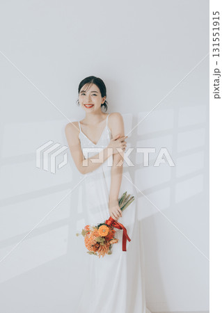 ウェディングドレスを着てドライフラワーのブーケを持っている女性