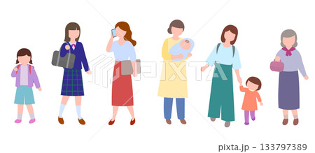 女性のライフステージ変化セット(独身・妊娠・育児)/可愛い手描き風イラスト