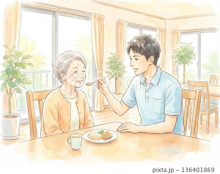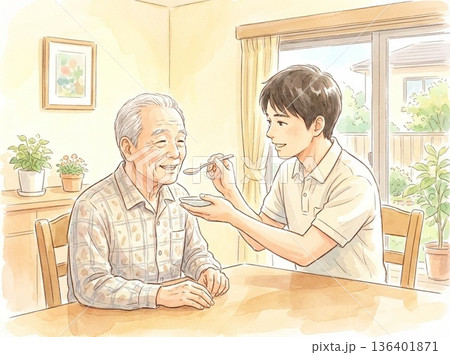 食事介助・福祉・介護イメージ。水彩風の優しいタッチの人物イラスト