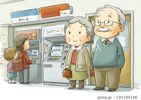 安心してATMを利用するシニア夫婦の金融サービスイメージイラスト