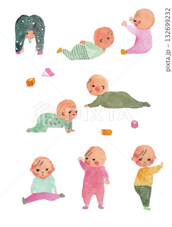 水彩で描いたハイハイや遊ぶポーズの赤ちゃんセット