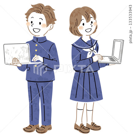 ノートパソコンを使う制服姿の男女の学生のイラスト 全身