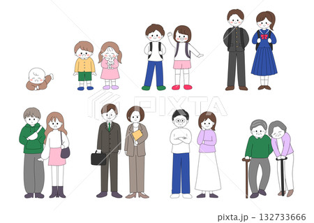 乳児から高齢者まで ライフステージ 男女ペアのイラストセット