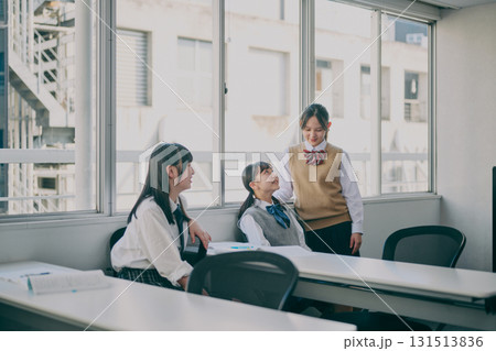 窓際で話している女子中学生たち