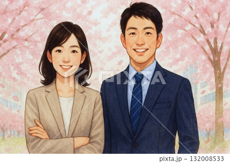 桜の下で笑顔を見せる若手社員 春のポートレート