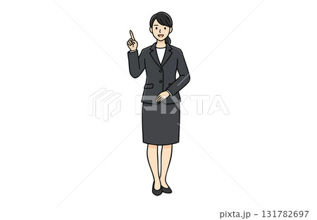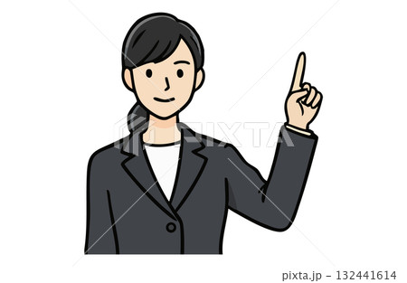 笑顔で上を指差すスーツ姿のビジネスウーマン女性