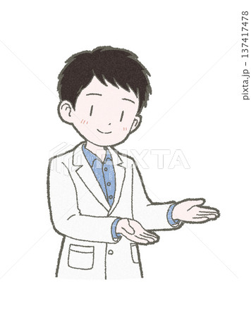 どうぞと両手で勧める白衣姿の医療関係者の男性の手書きイラスト素材