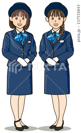 スカーフを巻いたスカートとパンツスーツ姿の受付や客室乗務員の全身イラスト