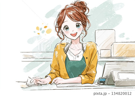カウンターで顧客対応をする女性ショップスタッフのイラスト