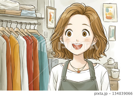 衣類リメイク商品を店舗で説明する若い女性スタッフのイラスト素材