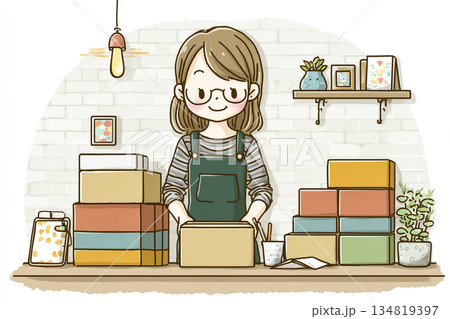 小包を準備する受付スタッフのフラットイラスト