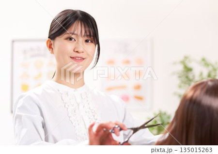 髪をカットする女性美容師 美容室
