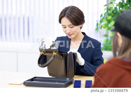 買取業者 バックと貴金属の査定をしてもらっている女性