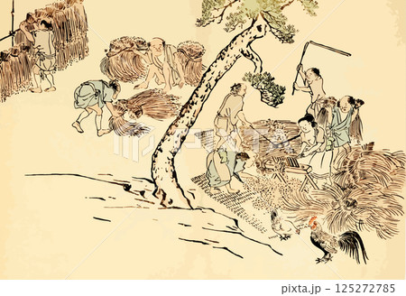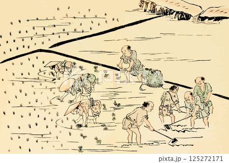 田んぼでコメの種を撒く男性たちのゆる画素材