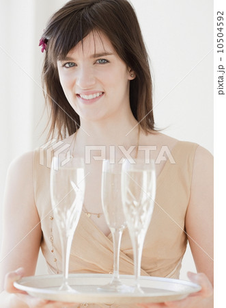 Portrait of young woman holding tray with champagne glasses
