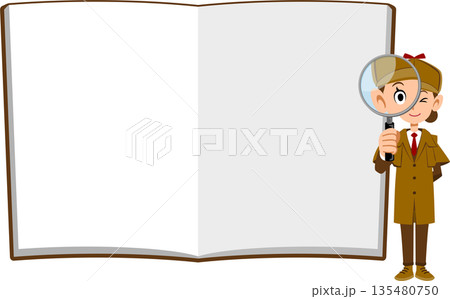 ノートの前で虫眼鏡をのぞく女性の探偵