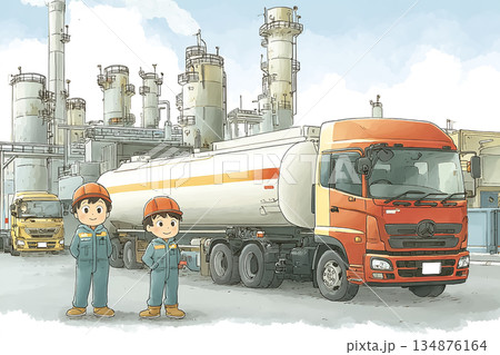石油精製所前に並ぶタンクローリーと作業員たちの産業物流イラスト
