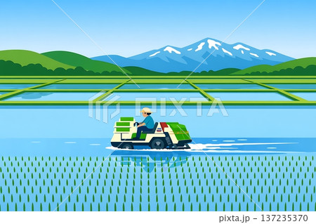 日本の里山風景 田んぼ 田植え 春 ベクター