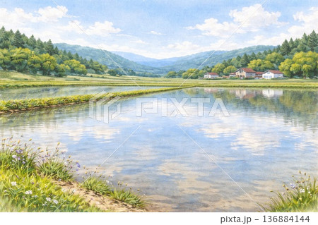 日本の里山風景 田んぼ 田植え 春 水彩画
