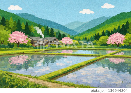 日本の里山風景 田んぼ 田植え 春 貼り絵風