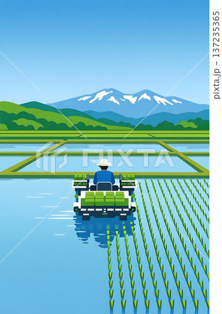 田植え 田んぼ 田 稲作 里山風景 5月 アニメ風