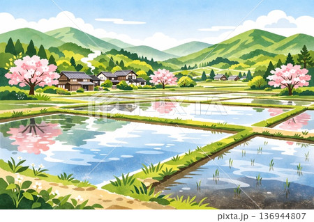 日本の里山風景 田んぼ 田植え 春 アニメ風
