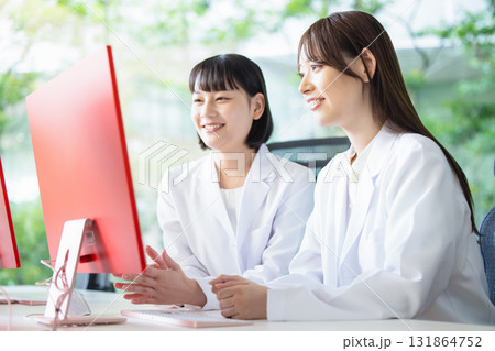会話する白衣の女性