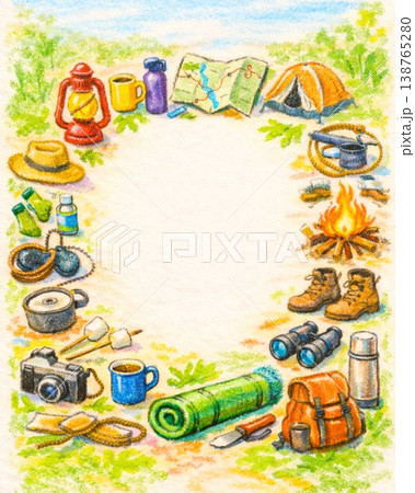 キャンプ道具のイラスト円形レイアウト コピースペース背景
