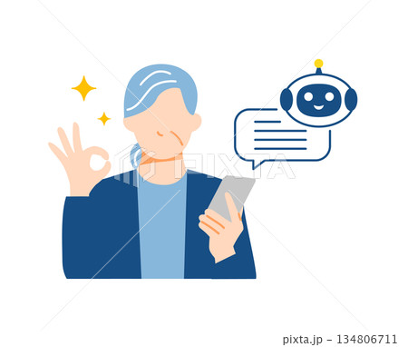 スマホでAIを使用してポジティブな表情のシニア女性のイラスト。フラットデザイン。