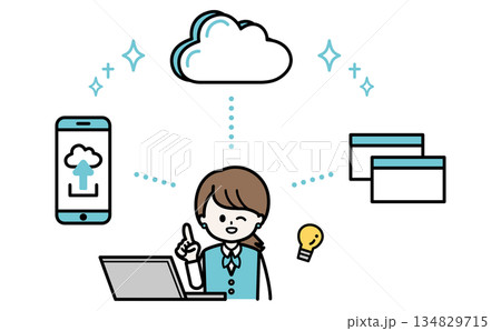 クラウドサービスで仕事が楽になる女性スタッフのイラスト DXとデータ管理と業務効率化の挿絵