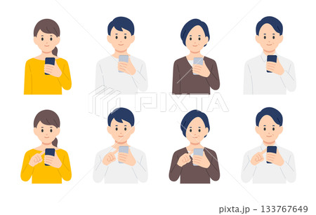 スマホを持つ・操作する若い・中年男女のセット【人物ベクターイラスト素材】