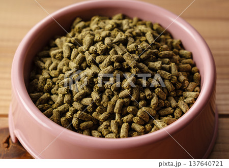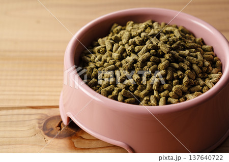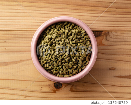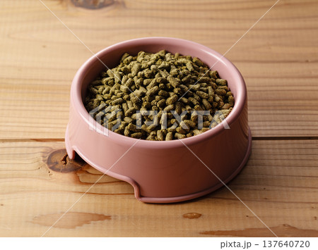 ピンクの皿に盛られたうさぎの餌(ペレット) 木目背景