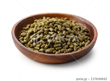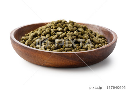 白背景に置かれた木製ボウル入りのウサギの餌(ペレット)