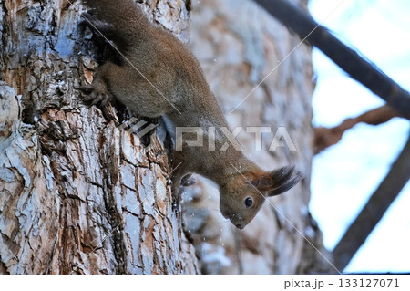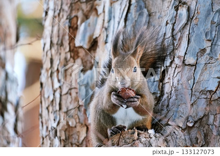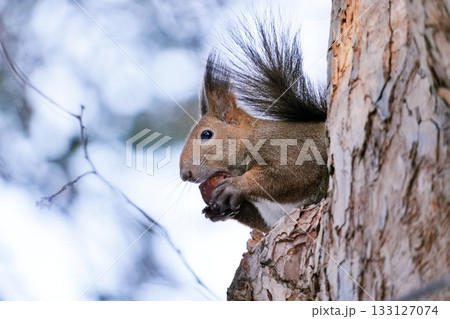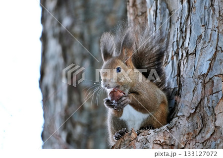 木の上でクルミを食べる冬のエゾリス