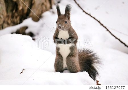 雪の中で立ち止まるエゾリス