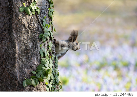 早春の森と可愛いエゾリス