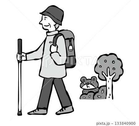 モノクロ 熊よけの鈴をつけて山登りをする男性(シニア)