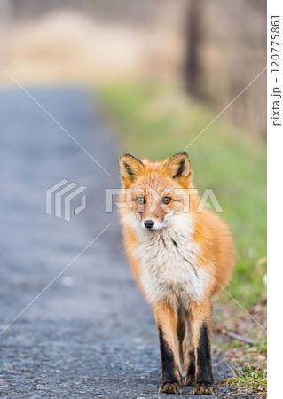 道路に立つキタキツネ
