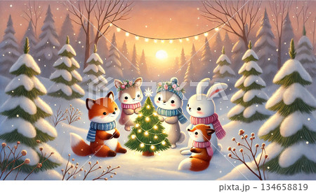 夕焼けに染まる雪の森で小さなクリスマスツリーを囲み動物たちが集う幻想的な冬のイラスト