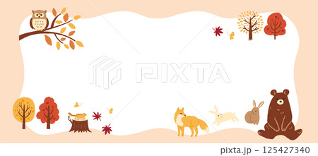 北欧風オシャレな秋の植物や森の動物の白バックフレームのイラストベクター素材