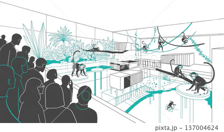 猿の展示施設イラスト素材 動物園 来園者 サル舎 モンキーケージ 熱帯植物 線画 背景素材