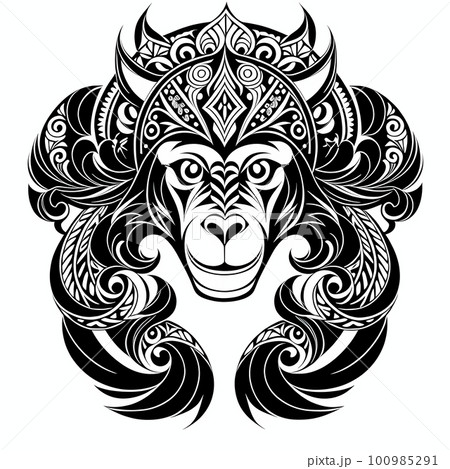 Monkey or ape's head, ornate sticker or tatoo design, black on white background. AI generated image