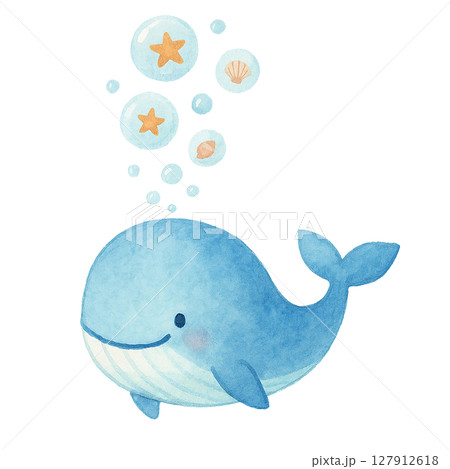 海のバブルホエールとシェルバブル 水彩風切り抜き素材