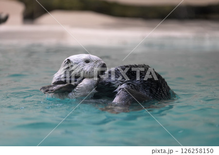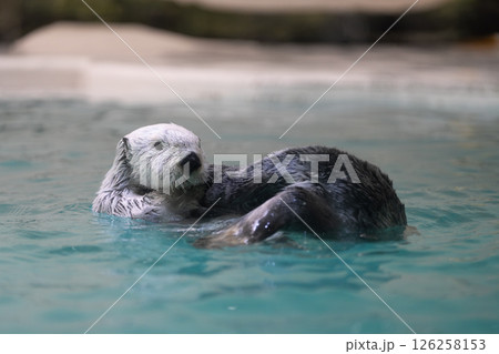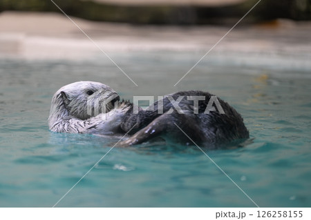 泳ぐラッコ かわいい動物 絶滅危惧種 水に浮んでいるラッコ