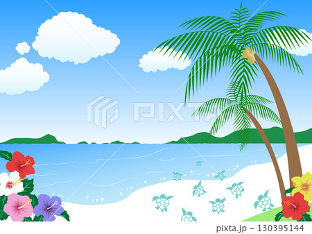 トロピカル素材 キラキラしたビーチにウミガメの赤ちゃん