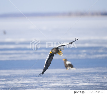 北海道羅臼町の沖合の流氷の上を飛ぶオオワシ